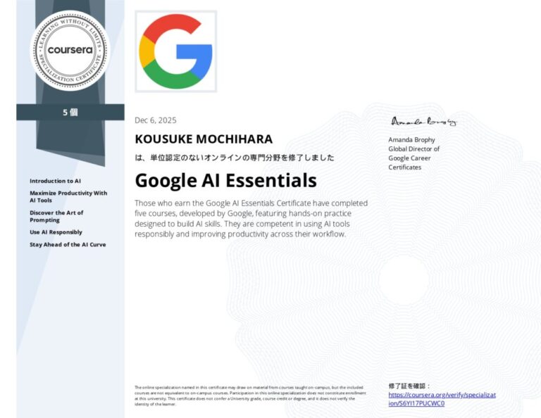 このたび弊社では、Google が提供する公式オンライン講座「Google AI Essential […] -